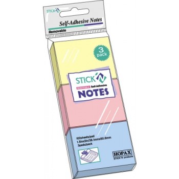Notes autoadeziv 51mm x 38mm, 3x100 file/set, 3 culori pale, Stick'n, HO-21126