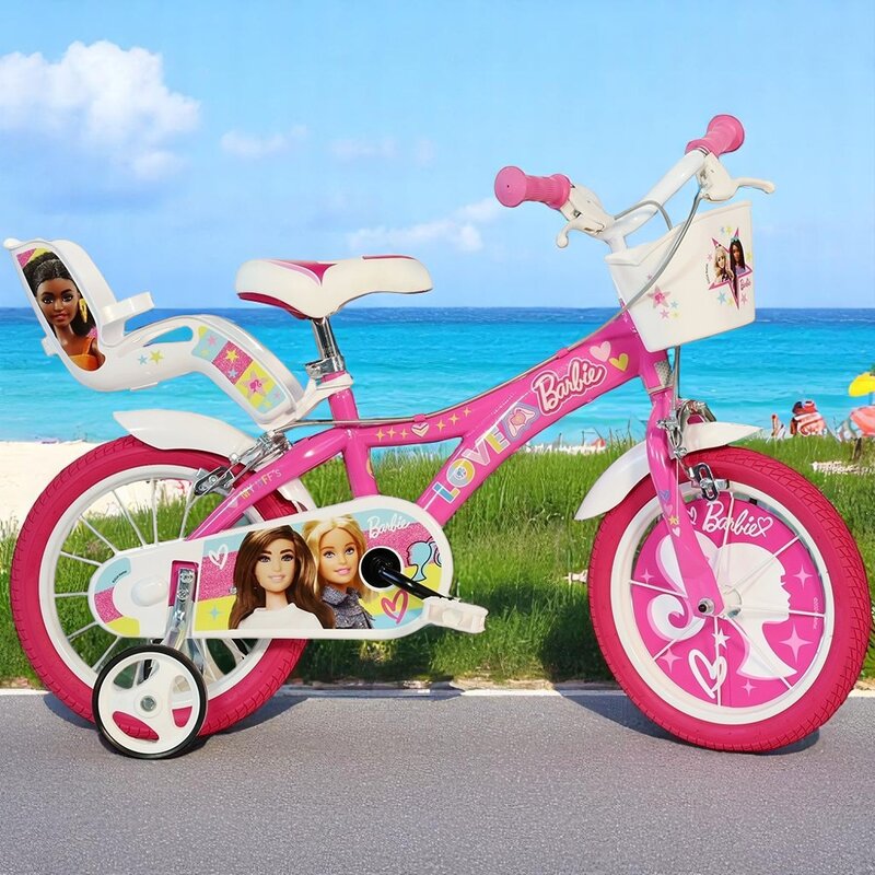 Bicicleta copii, Dino Bikes, Barbie, Roti ajutatoare, Cosulet frontal, Scaunel pentru papusi, 16 inch, Cadru din otel, Pana la 125 cm, Pink