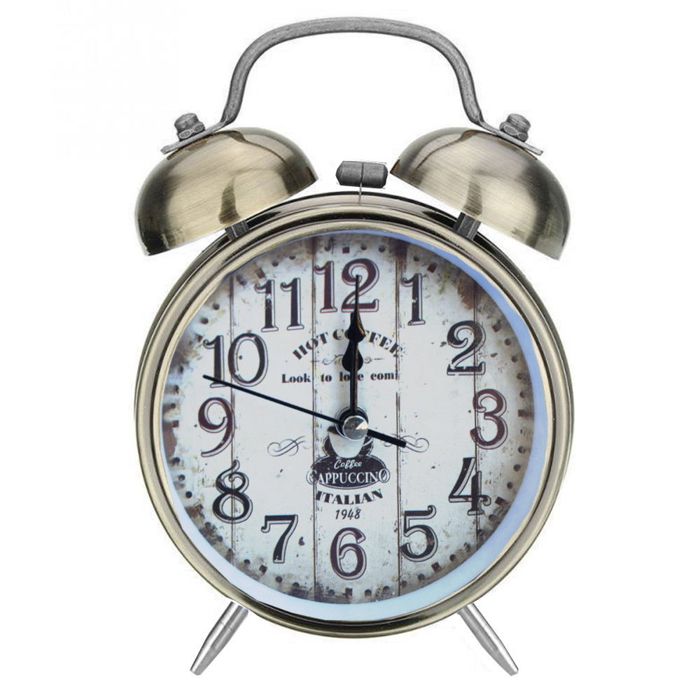 Ceas de masa desteptator Pufo Hot Coffee cu buton de iluminare cadran, metalic, 16 cm, aramiu