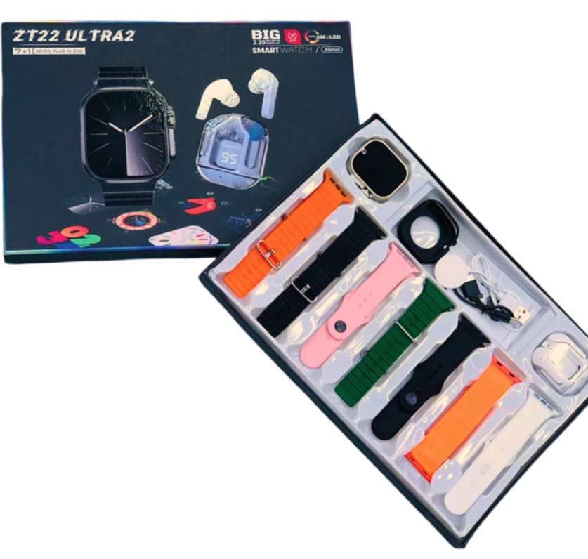 Set Cadou Smartwatch ZT22 Ultra2 cu 7 Bratari incarcator Wireless si Casti Bluetooth