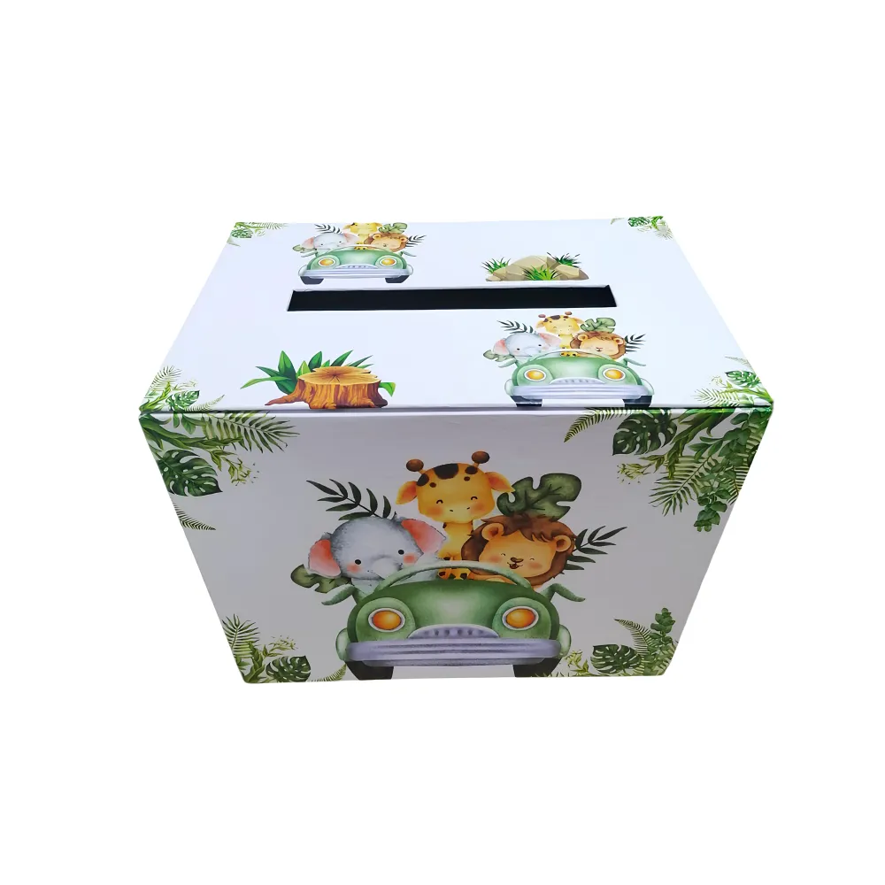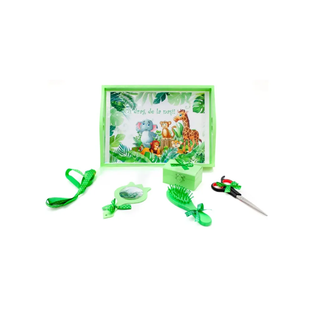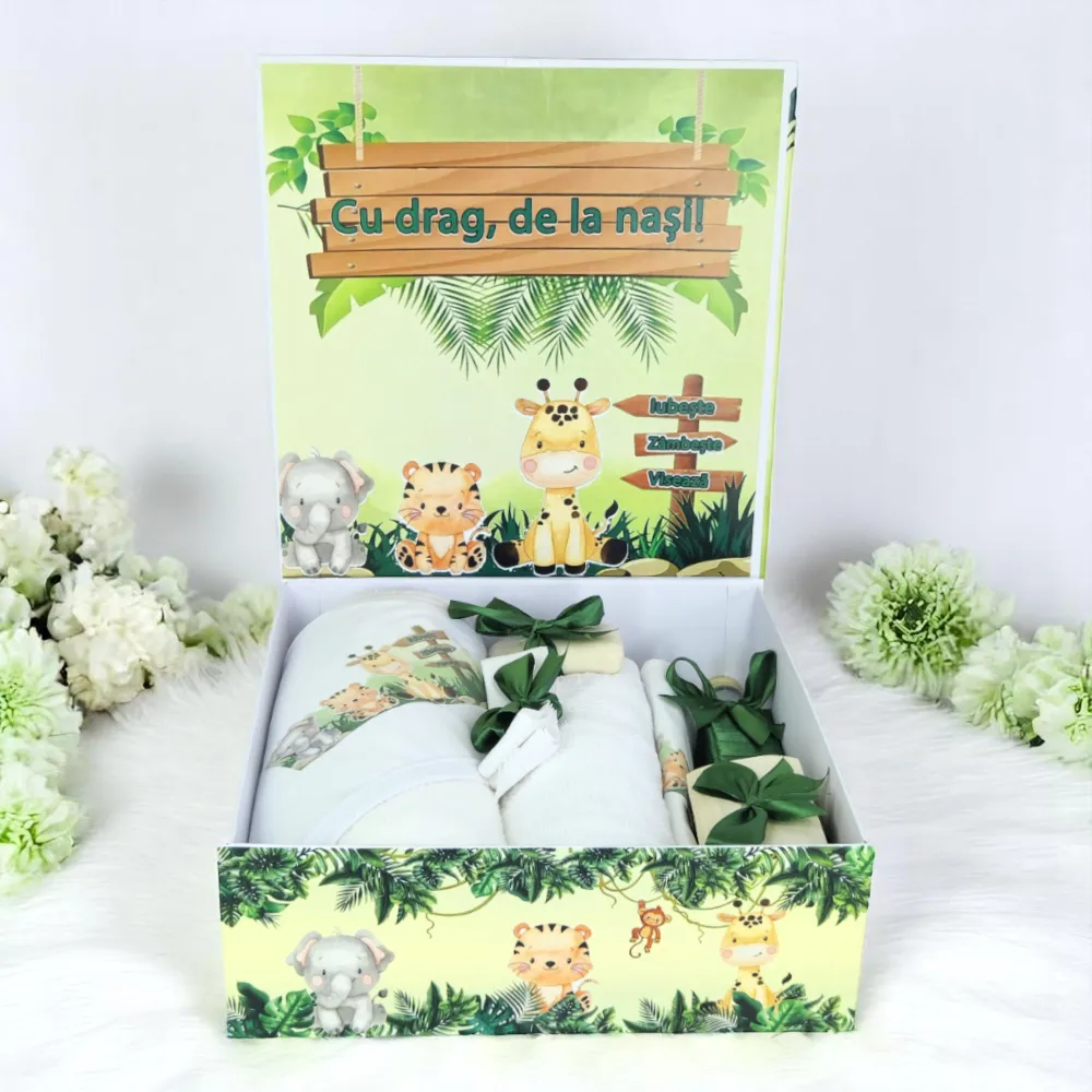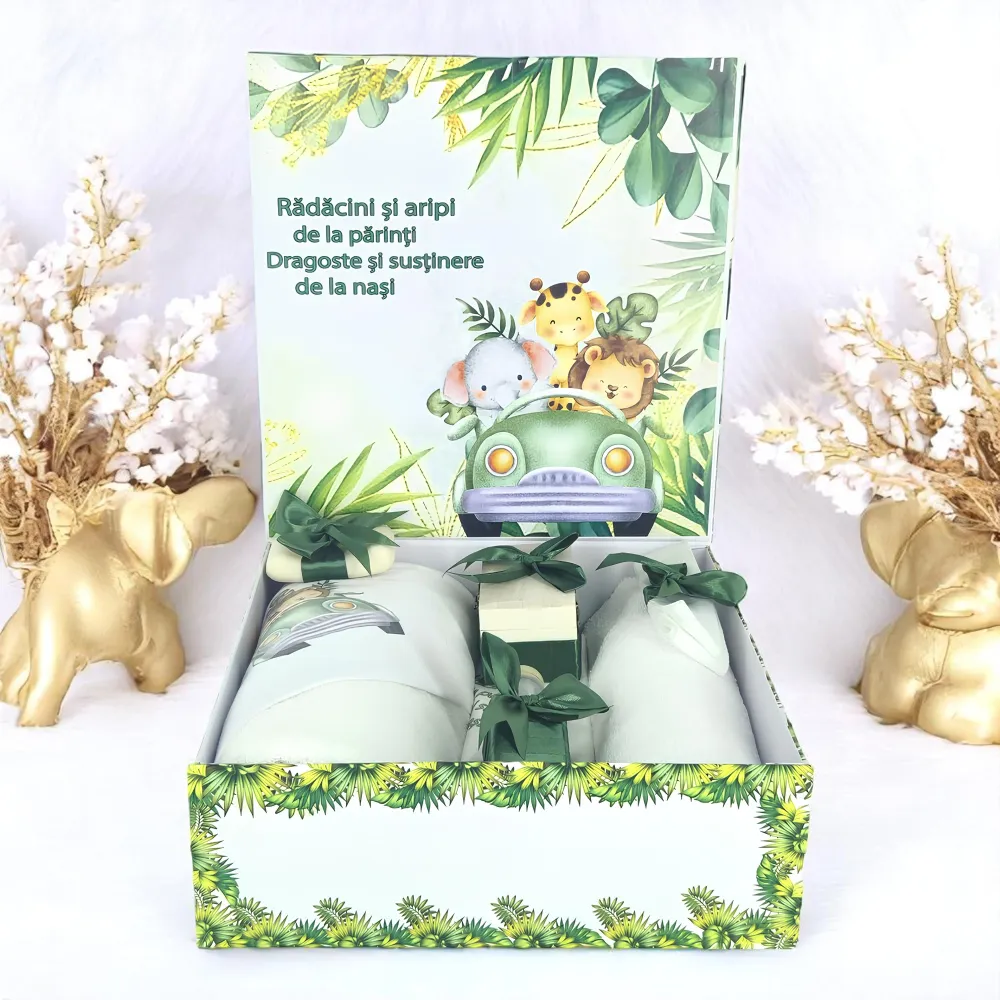 Trusou Botez cu 8 Piese Imprimat, Animale Safari, Culoare Verde Inchis - TB224