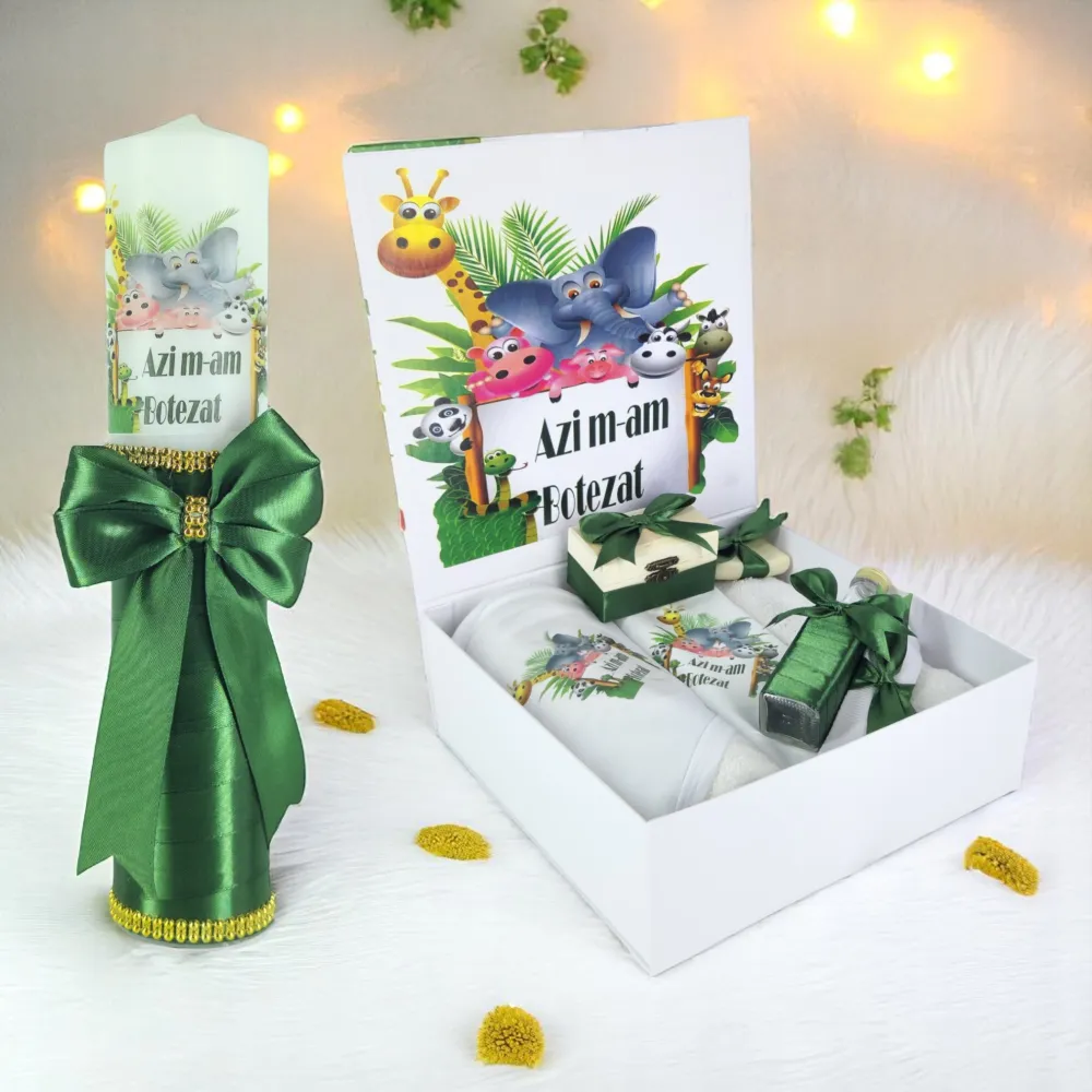 Set Cutie Trusou cu Lumanare, 9 Piese, Azi m-am Botezat, Verde Safari Animale - TB260