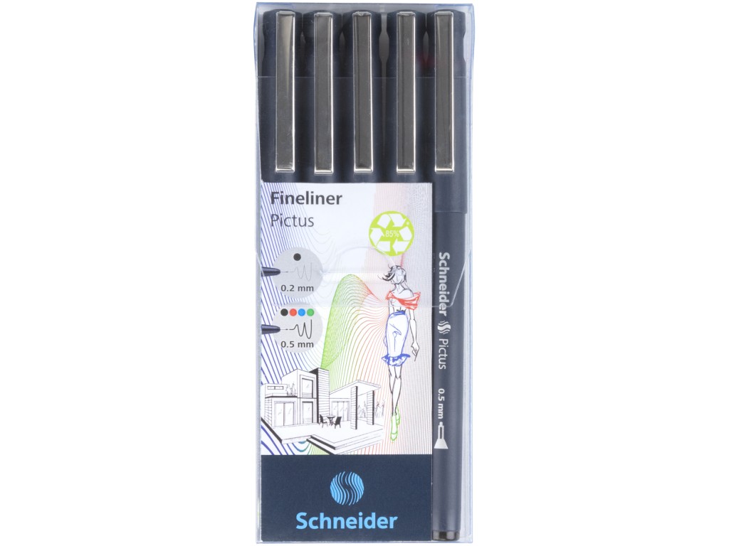 Liner 4 culori/set, varf 0.5mm + liner negru, varf 0.2mm, Fineliner Pictus Schneider