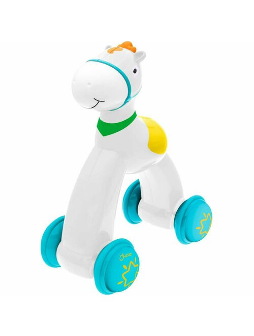 Jucarie push-go, Chicco, Cal, Cu roti, Design colorate si atragator, Emite sunete la utilizare, 12-36 luni, 18 x 11 x 26 cm, Alb