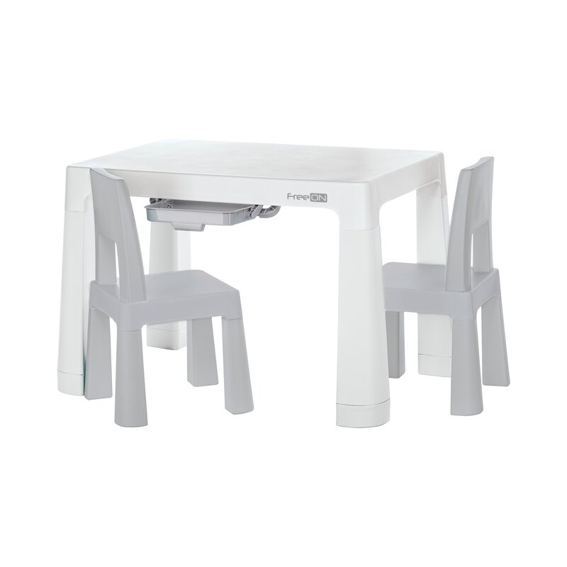 Set masuta si doua scaune, FreeON, Neo, Pentru copii, Cu doua sertare, Cu masa reglabila la doua inaltimi, Conform cu standardele europene de securitate EN71-1;2018, EN71-2:2020, EN71-3:2021, Gri