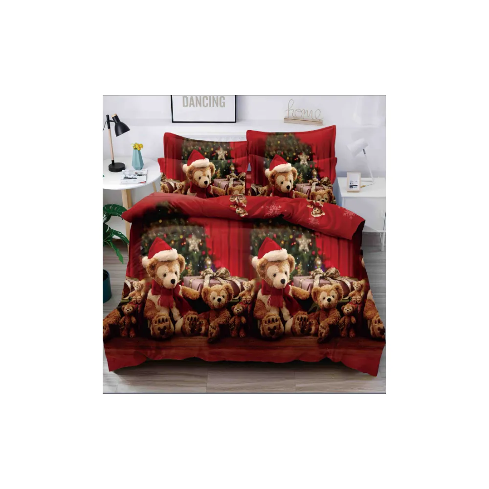 Lenjerie de Pat 1 Persoana, Bumbac Finet, 4 Piese, Rosu cu Ursulet - JO585