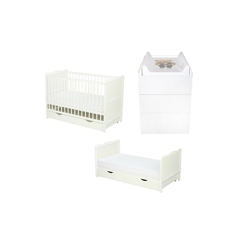 Set mobilier pentru copii, BabyNeeds: Patut din lemn de pin si MDF, cu somiera reglabila in 3 trepte, Timmi, 120x60 cm + Saltea cocos-burete-cocos, 12 cm + Comoda cu masuta de infasat, Alb