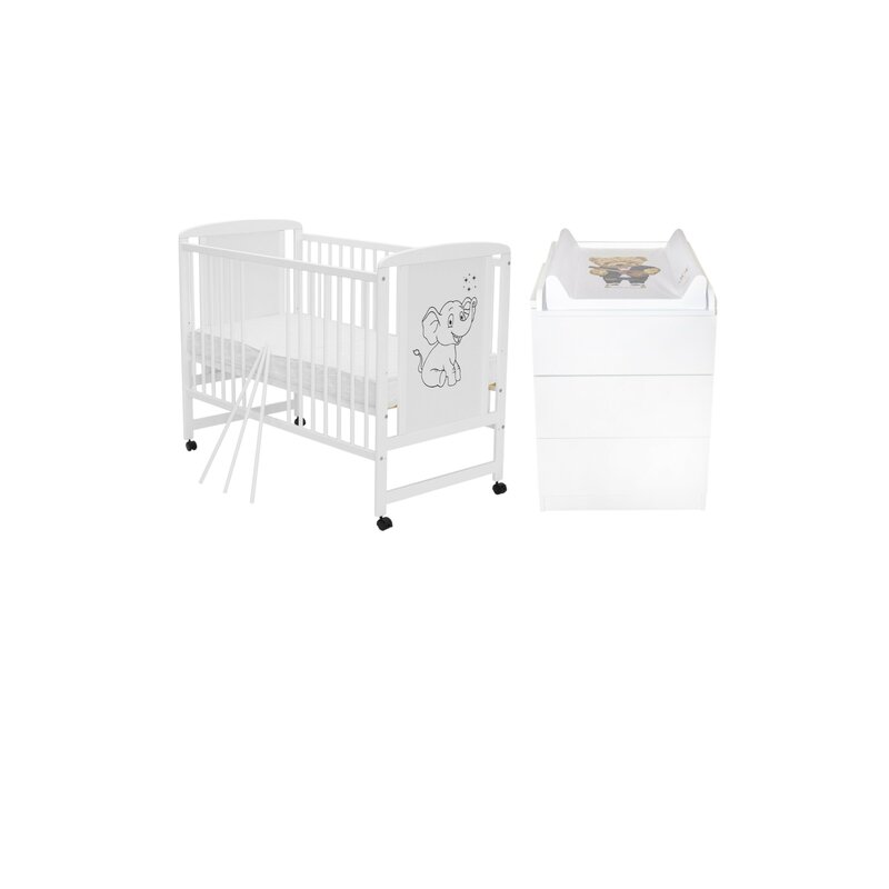 Set mobilier pentru copii, Qmini: Patut din lemn de pin si MDF cu roti, cu somiera reglabila in 3 trepte, Timmi Elefant, 120x60 cm + Saltea cocos-burete-cocos, 12 cm + Comoda cu masuta de infasat, Alb