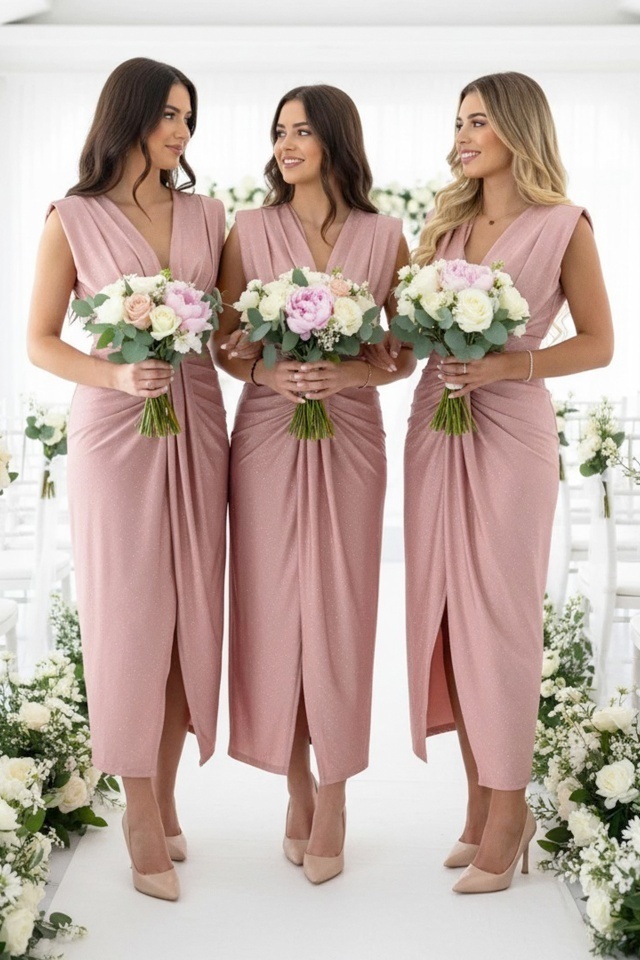 Set 3 bucati Rochie lunga de seara JHOSY, cu paiete, Roz Pudrat, Marime S/M