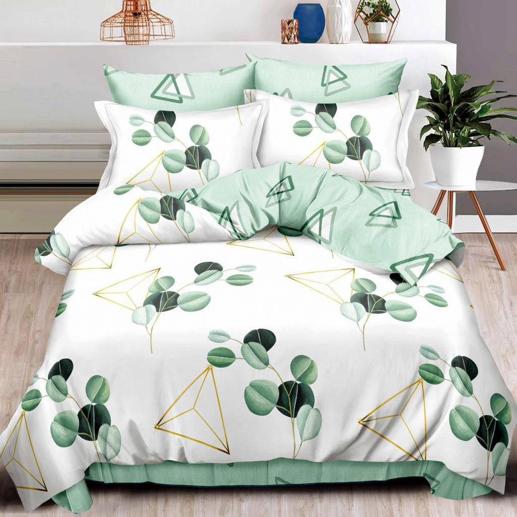 Lenjerie pat dublu cu ELASTIC, Finet, 6 piese, Alb-Verde, frunze, forme geometrice