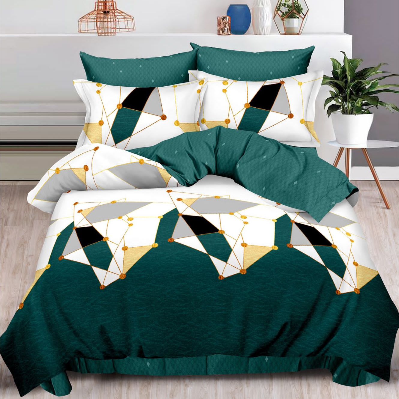 Lenjerie pat dublu cu ELASTIC, Finet, 6 piese, Verde, forme geometrice