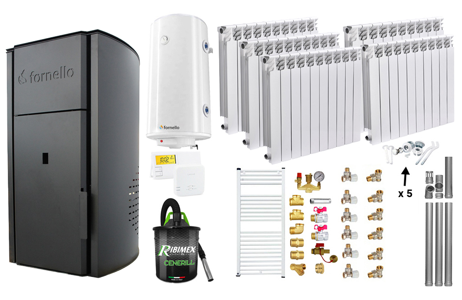 Pachet Centrala pe peleti Fornello Fiama Confort B 25 kw, Pompa, Vas expansiune, Automatizare, Calorifere aluminiu Fornello Alvo, Boiler 100 litri, Termostat, Aspirator, Kit 3.5 ml si Fitinguri montaj