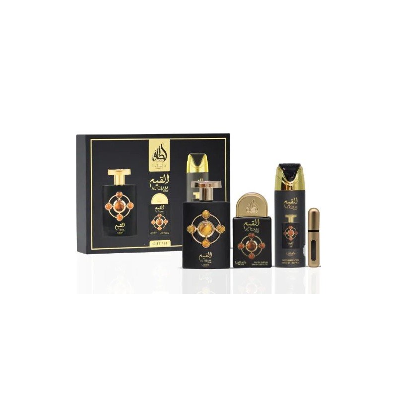 Lattafa Pride Al Qiam Gold Set cadou unisex Volum EDP 100 ml + EDP 20 ml + deodorant spray 200 ml + reumplere