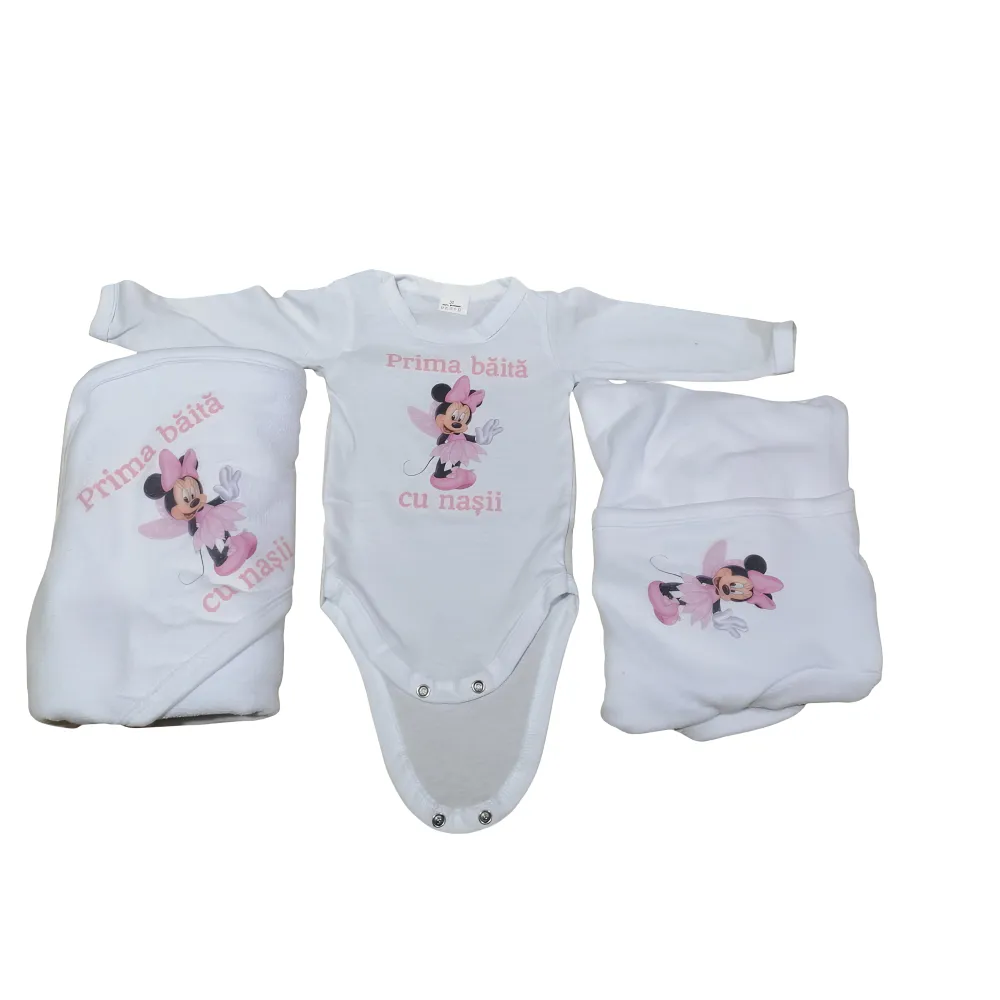 Trusou Botez 6 piese cu text imprimat Minnie Mouse ALB - ROZ PUDRA - TB100