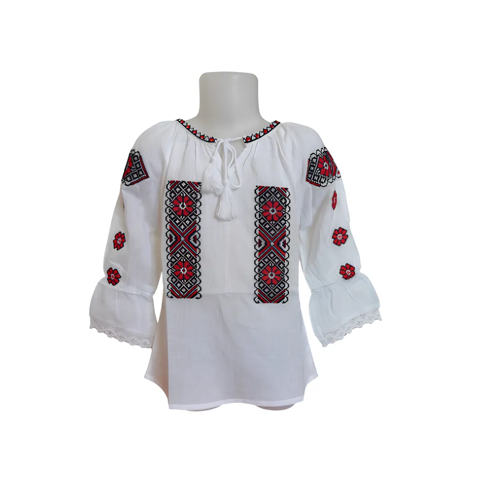 Ie Traditionala Alba pentru Fetite cu Motiv Geometric Rosu - ITF08