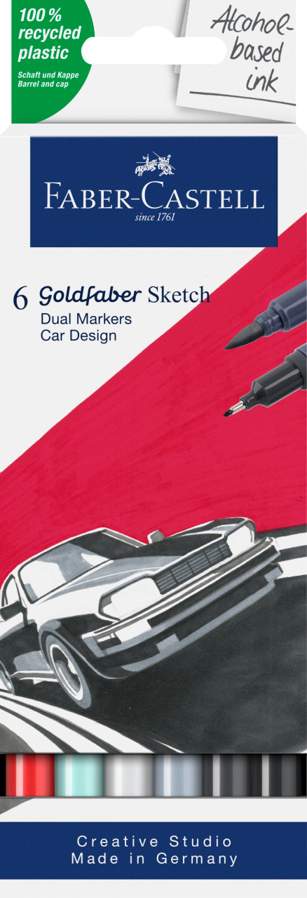 Markere cu 2 varfuri (rotund+pensula), 6culori/set, Car Design, Goldfaber Faber-Castell - FC164813