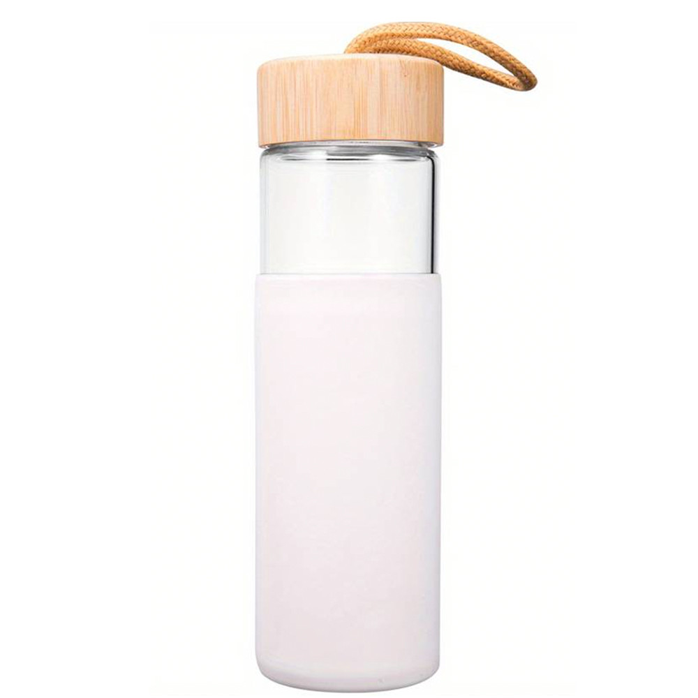 Sticla Pufo Hydrate pentru apa sau lichide din material borosilicat cu protectie din silicon si capac etans din bambus, 550 ml, alb
