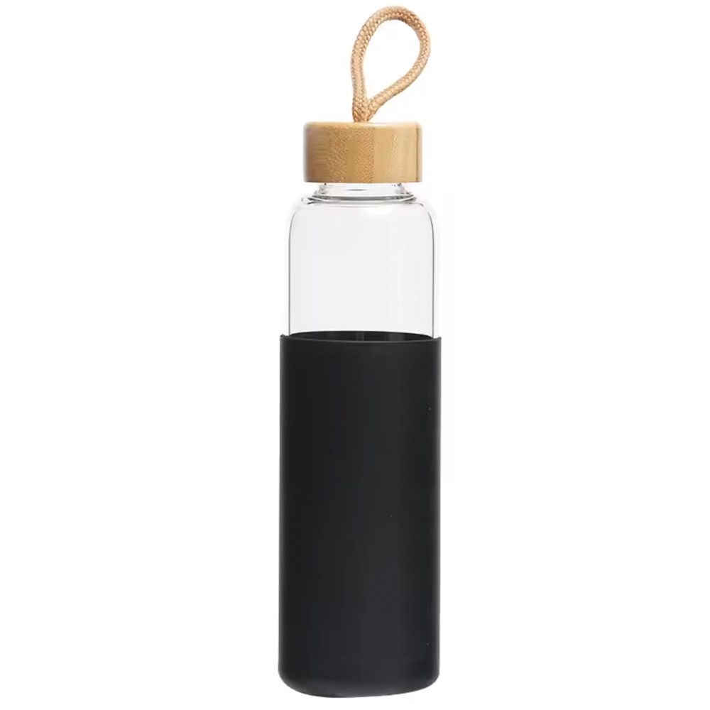 Sticla pentru apa sau lichide din material borosilicat cu protectie din silicon si capac etans din bambus, 550 ml, negru