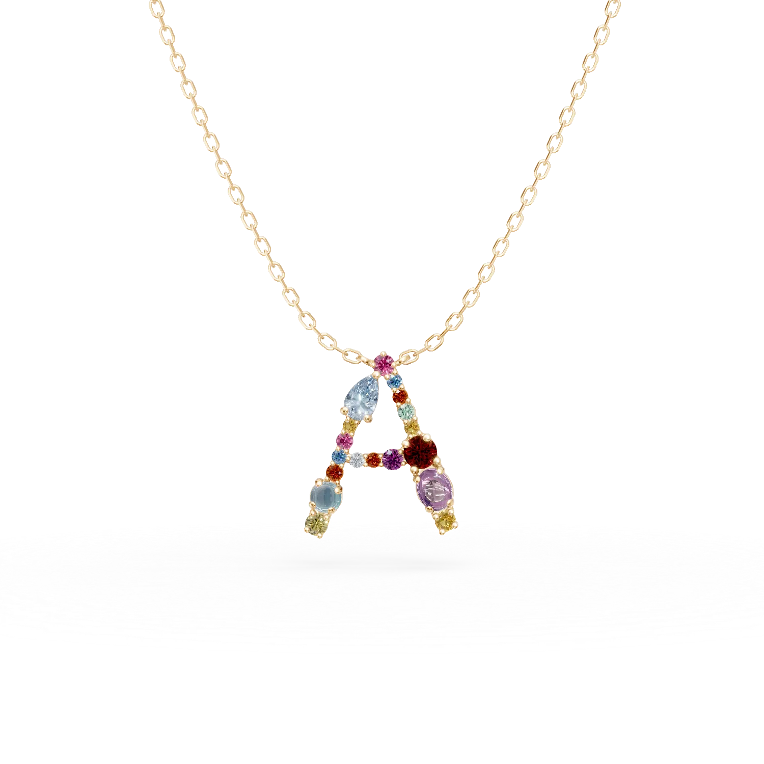 Lant cu pandantiv initiala A din aur galben cu pietre pretioase si semipretioase de 1ct