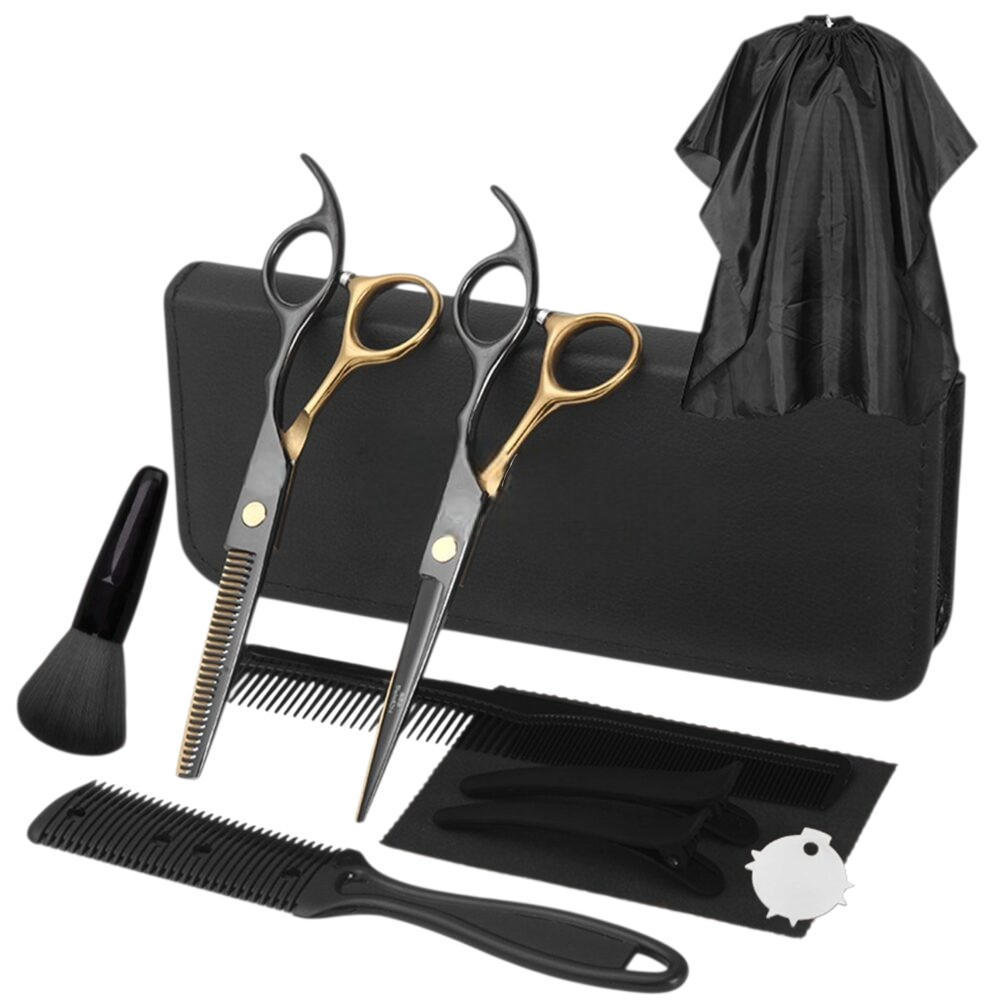 Foarfece profesionale de tuns si filat NewEvo , pentru frizerie,salon,coafor, husa piele + accesorii, otel japonez, 17 cm, set 10 piese, negru