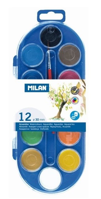 Acuarele pe baza de apa, 12 culori + pensula, pastila 30mm, Milan