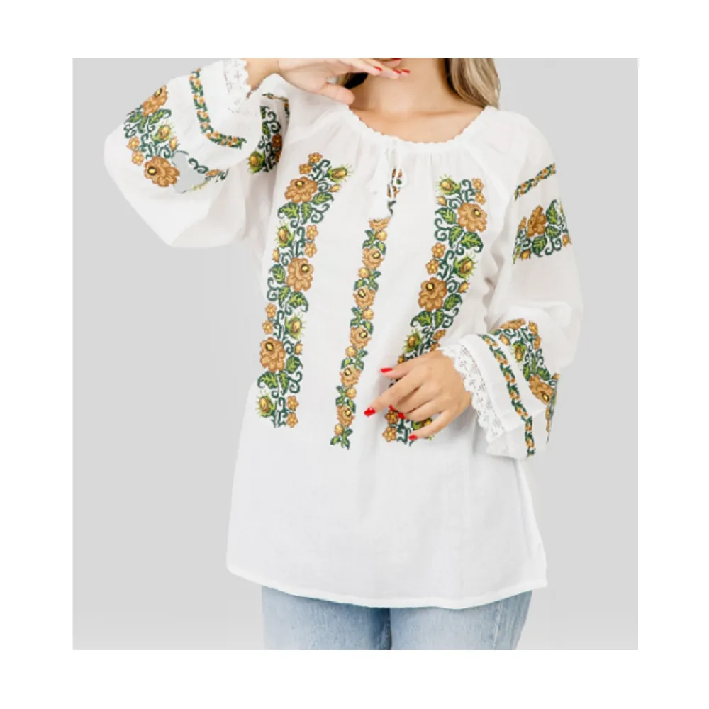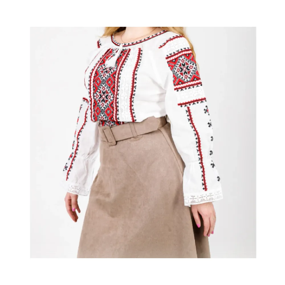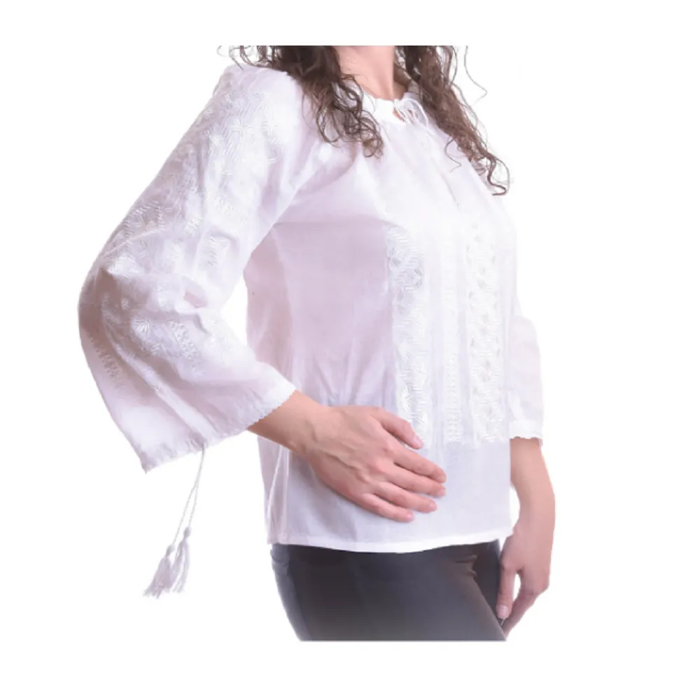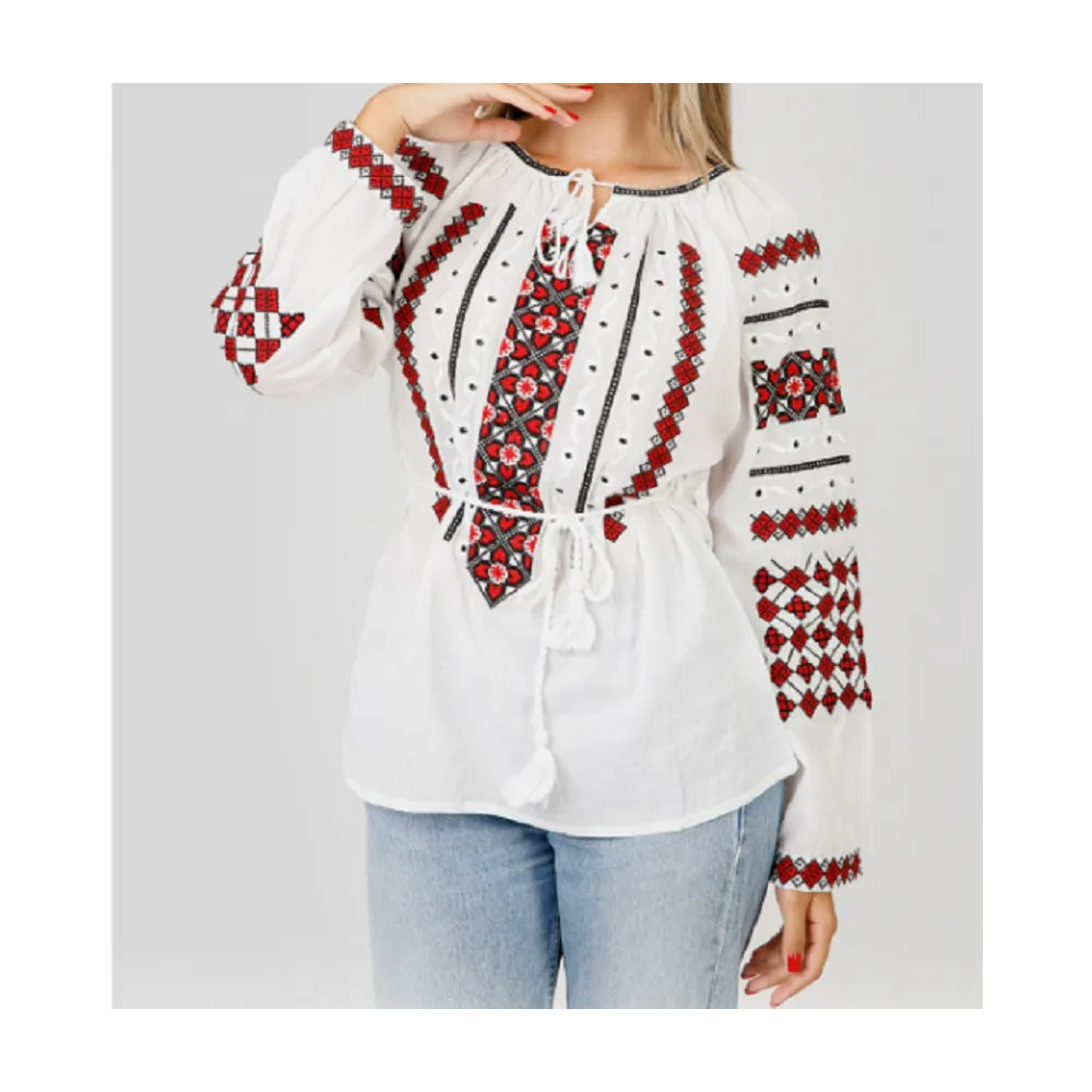 Bluza Tip Ie Traditionala Alba cu Motiv Floral Rosu de Dama- IMS32