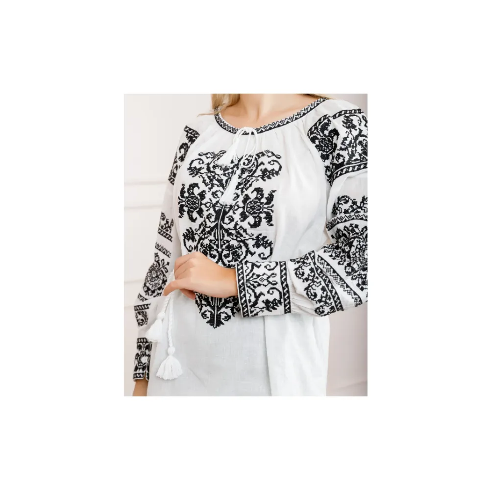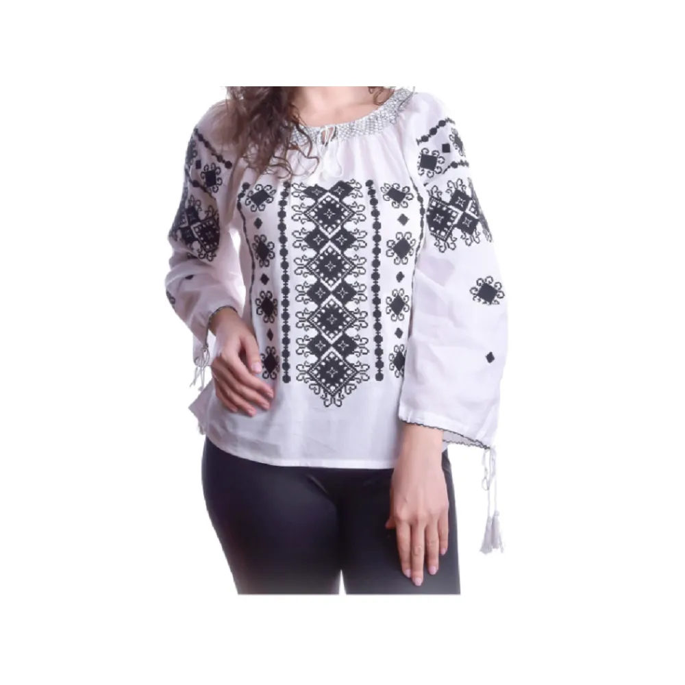 Bluza Tip Ie Traditionala Alba cu Motiv Geometric Negru de Dama - IMS63