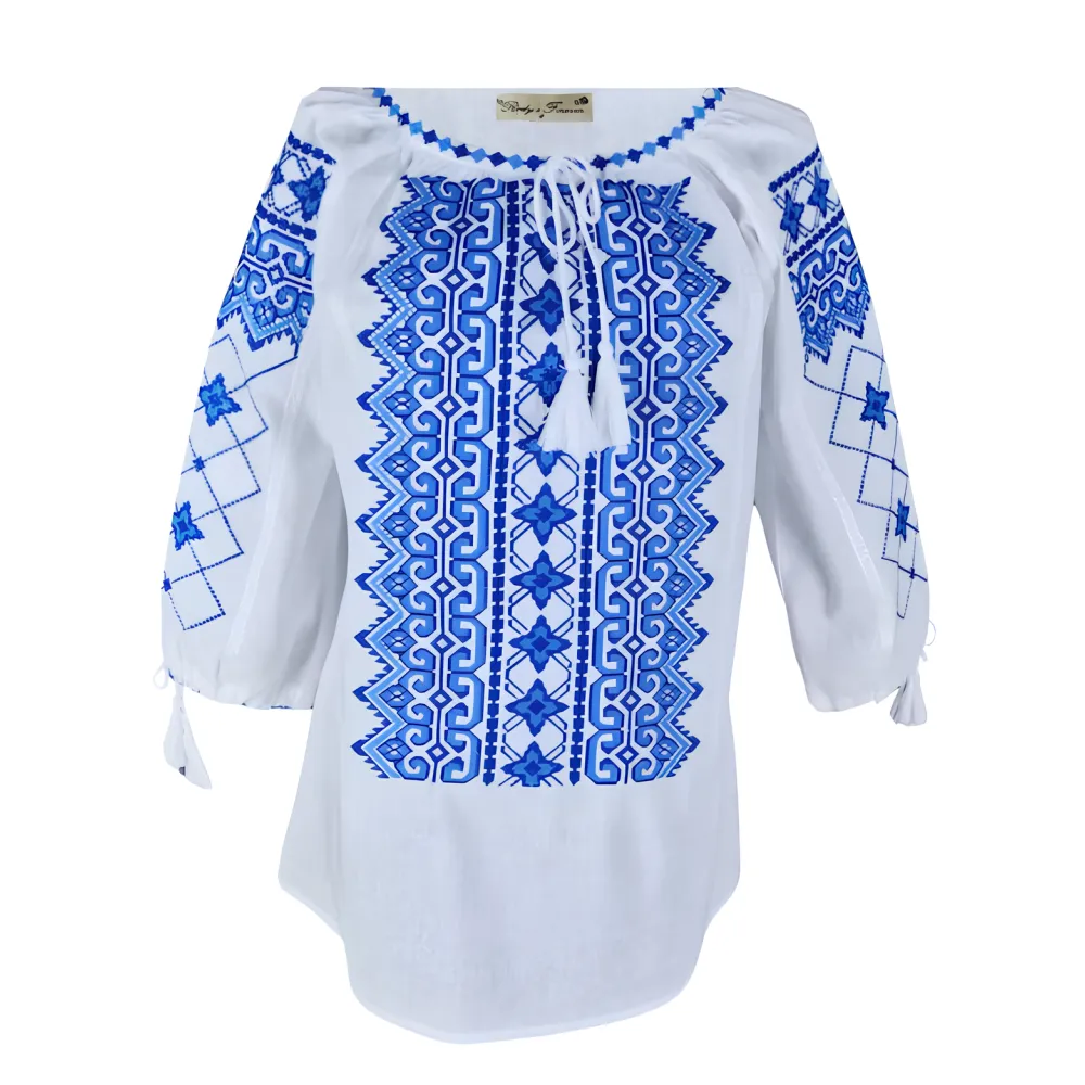 Bluza Tip Ie Traditionala Alba cu Motiv Geometric Albastru de Dama - IMS67