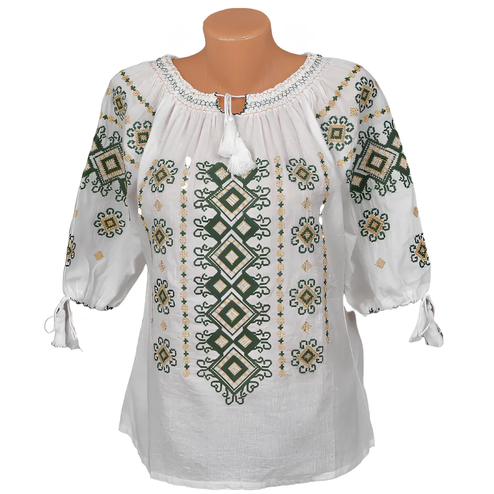 Bluza Tip Ie Alba cu Motiv Floral Verde - BMG39