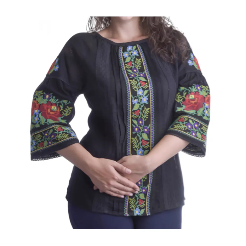 Bluza din matase si vascoza neagra brodata si dantela pe spate