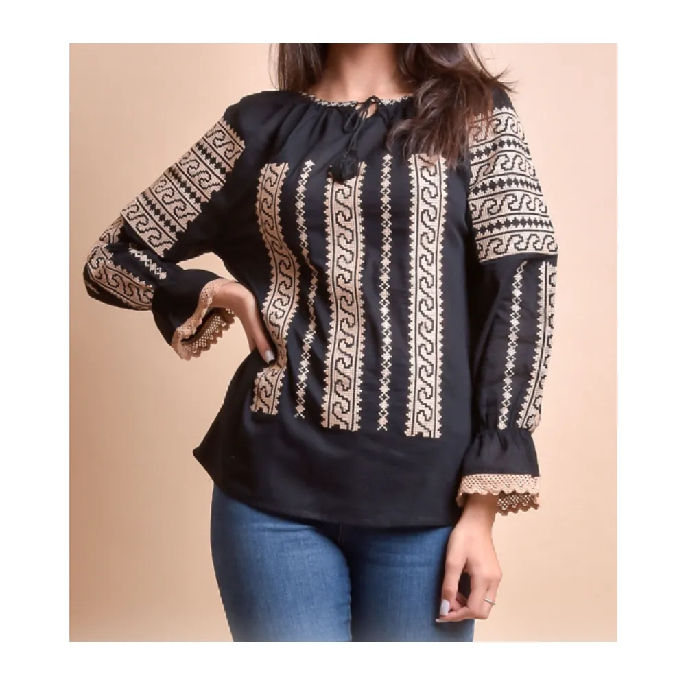 Bluza Tip Ie Traditionala Neagra cu Motiv Geometric Crem de Dama - IMS55