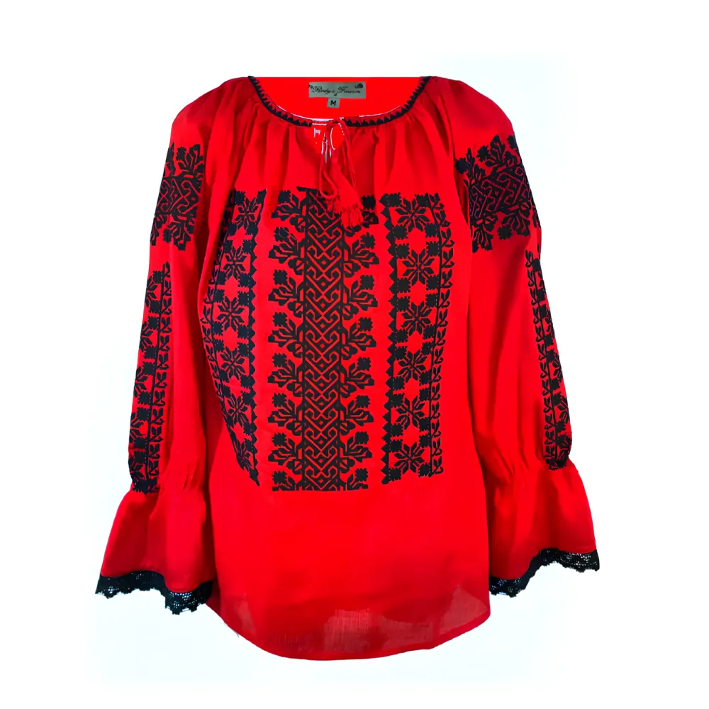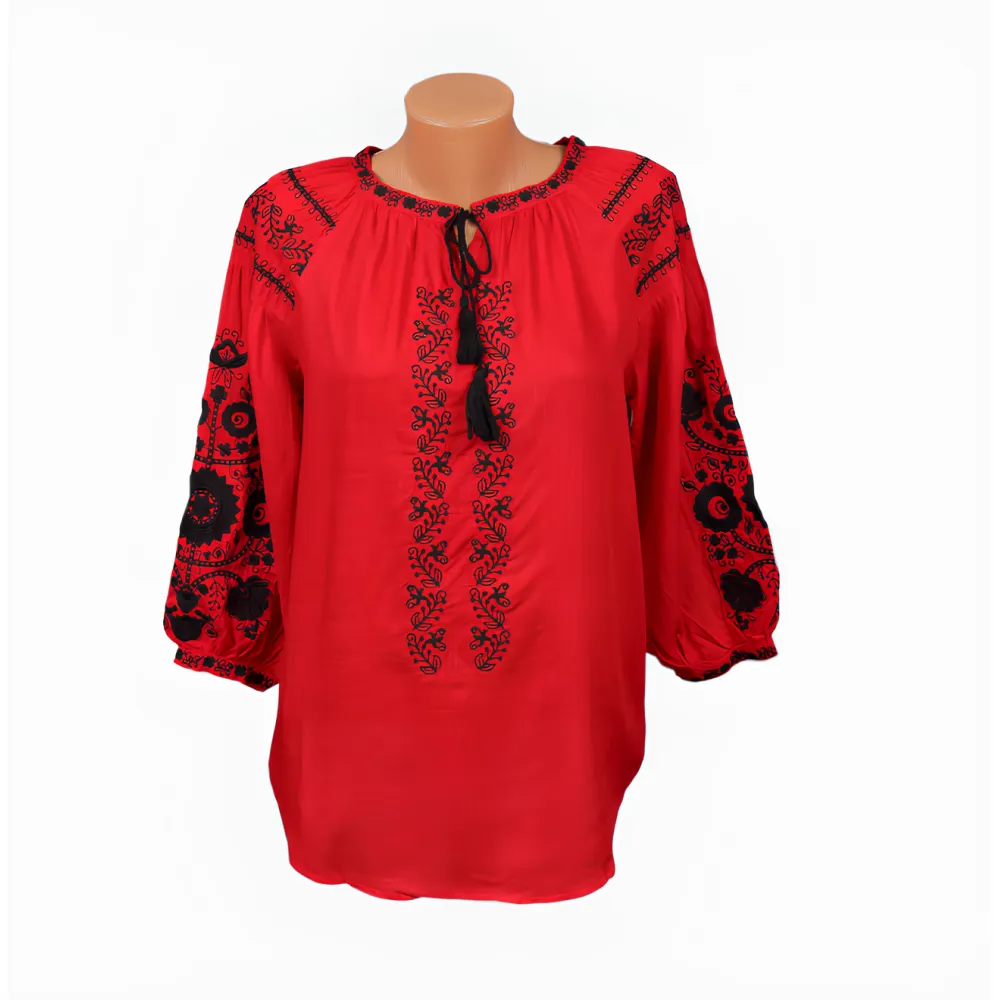 Bluza dama rosie cu volan in zona bustului si aplicatie din catifea neagra