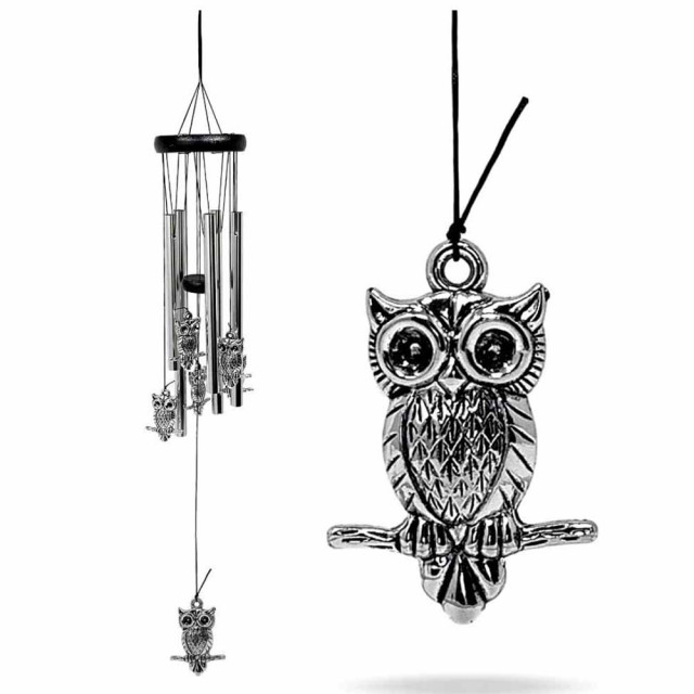 Clopotel de vant cu 5 tuburi sonore metalice argintii pentru casa sau gradina, model Feng-Shui cu bufnite