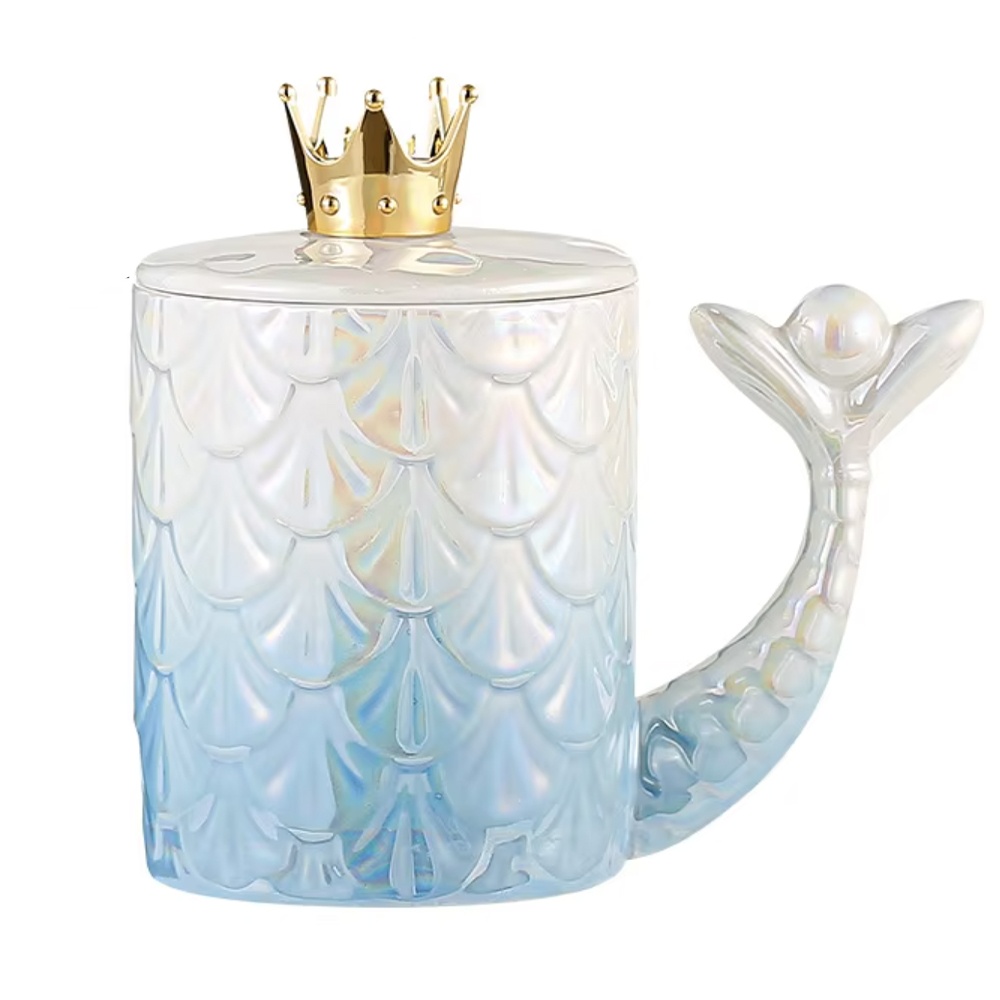 Cana cu capac din ceramica si lingurita Pufo Princess pentru cafea sau ceai, 300 ml, albastru
