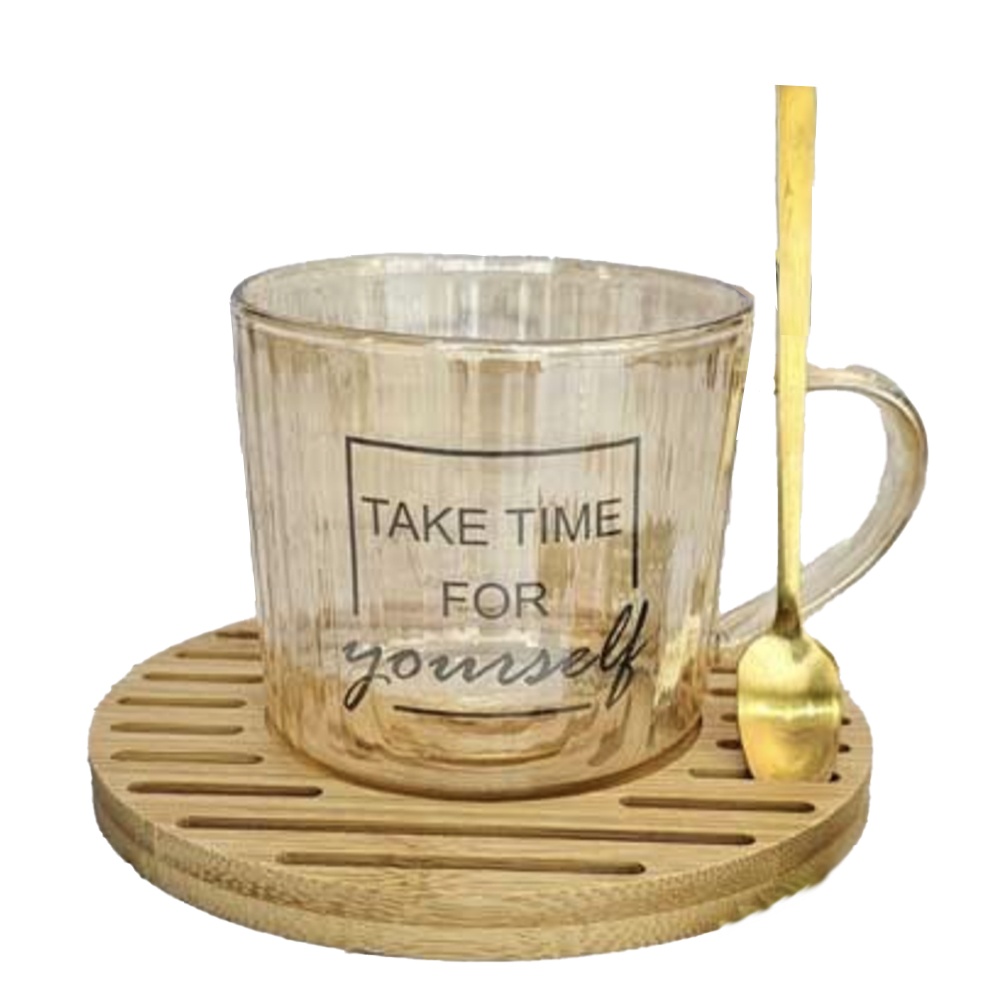 Cana din sticla cu suport din lemn de bambus si lingurita Pufo Take Time pentru cafea sau ceai, 200 ml