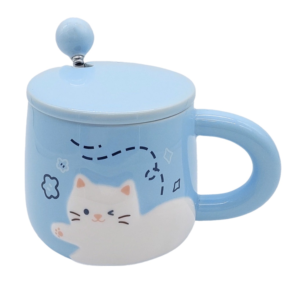 Cana cu capac din ceramica si lingurita Pufo Happy Kitty pentru cafea sau ceai, 350 ml, albastru