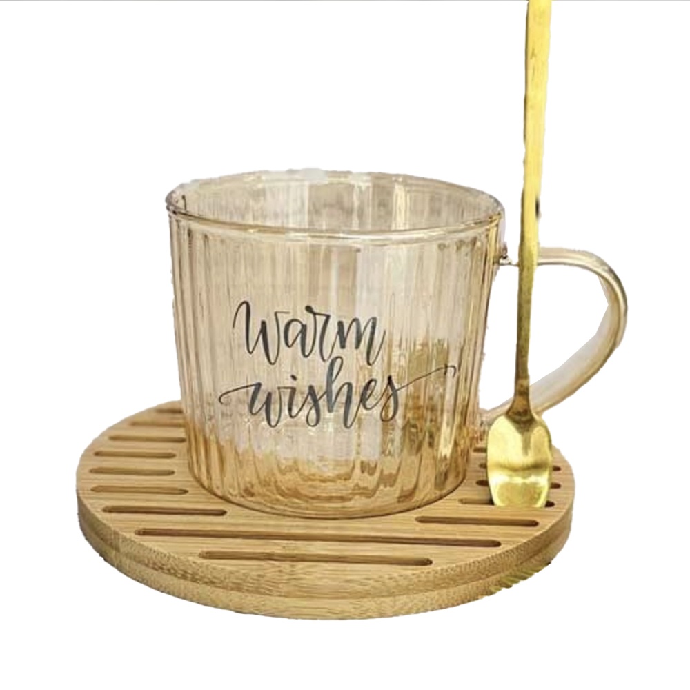 Cana din sticla cu suport din lemn de bambus si lingurita Pufo Warm Wishes pentru cafea sau ceai, 200 ml