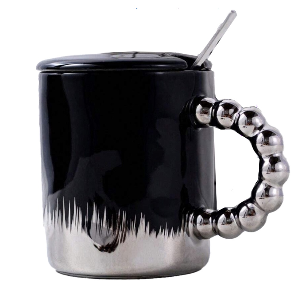 Cana cu capac din ceramica si lingurita Pufo Opulence pentru cafea sau ceai, 250 ml, negru/argintiu