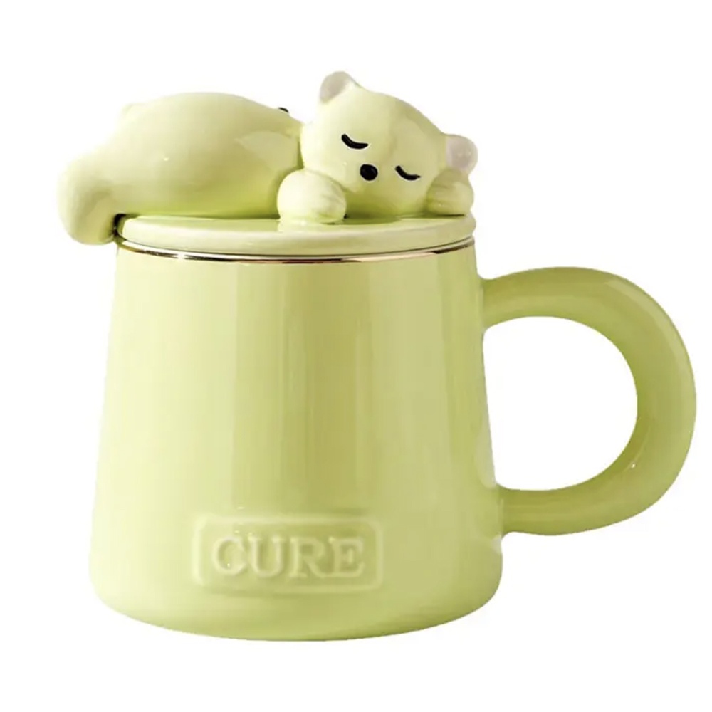Cana cu capac din ceramica si lingurita Pufo Love Kitty pentru cafea sau ceai, 250 ml, verde