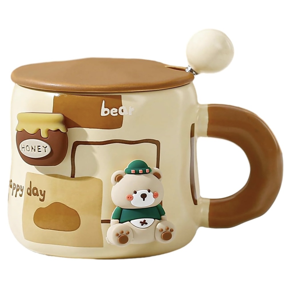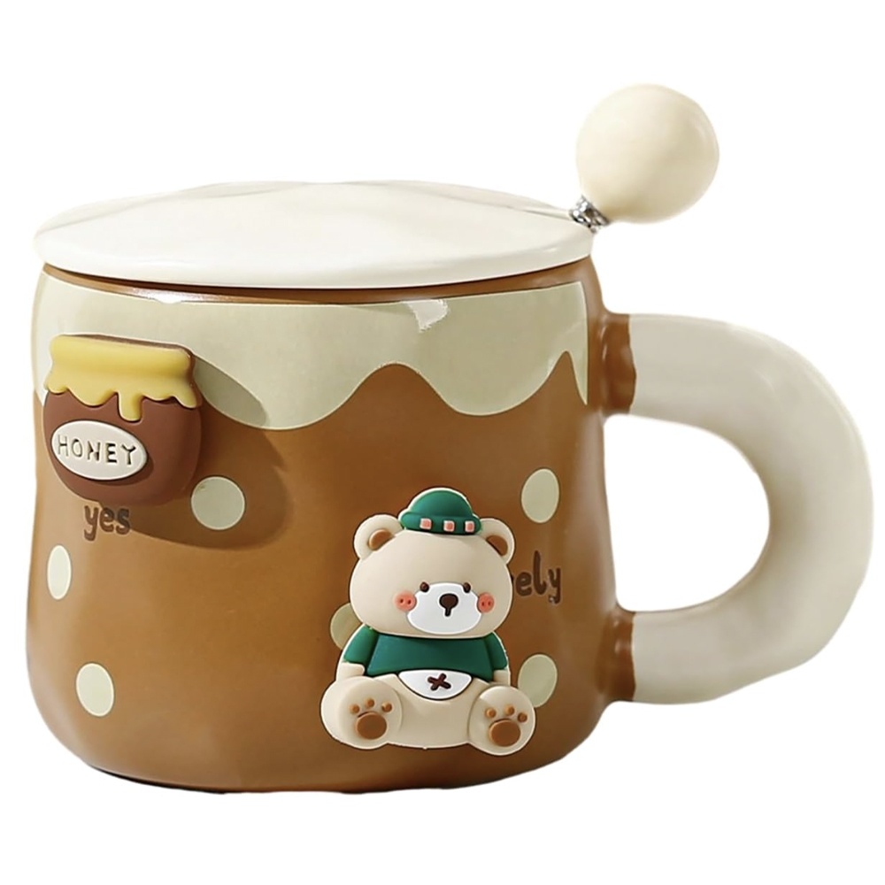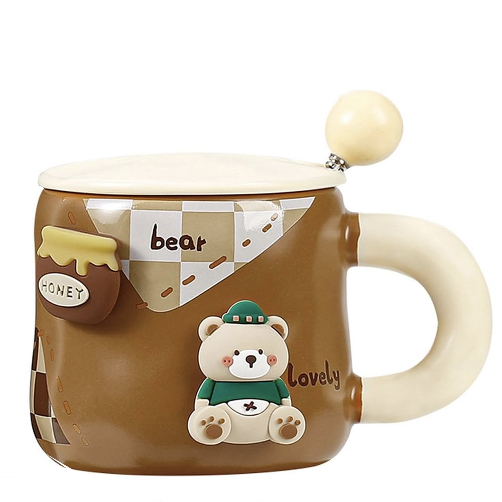 Cana cu capac din ceramica si lingurita Pufo Lovely Bear pentru cafea sau ceai, 350 ml