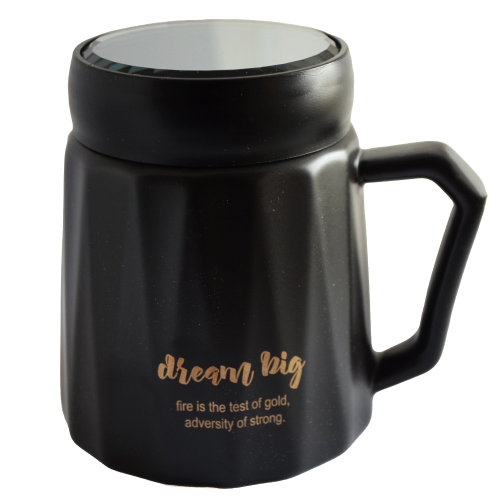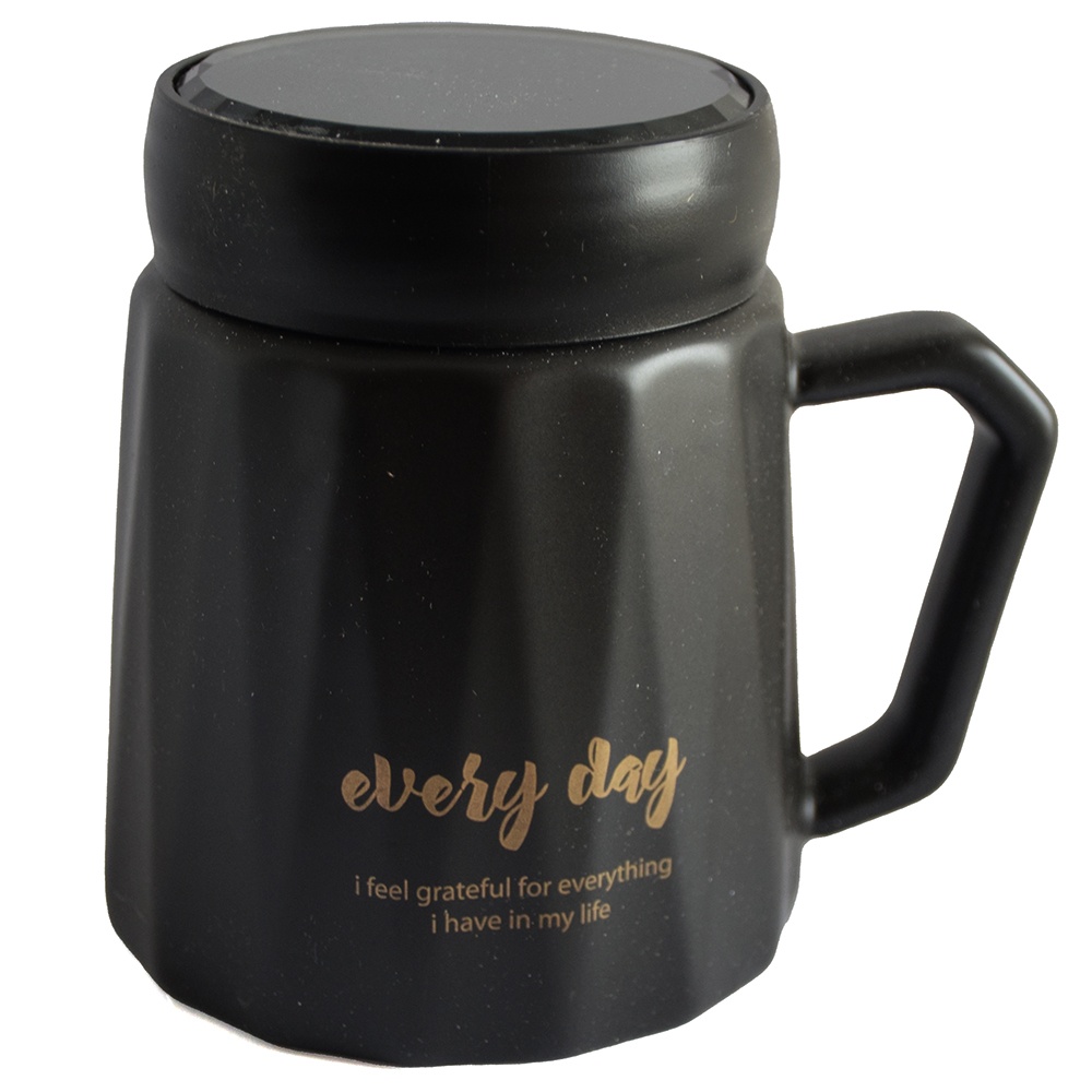 Cana din ceramica cu capac Pufo Simply Smile pentru cafea sau ceai, 400 ml, negru