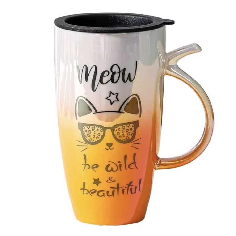 Cana inalta din ceramica cu capac Pufo Cool Cat, pentru cafea sau ceai, 450 ml