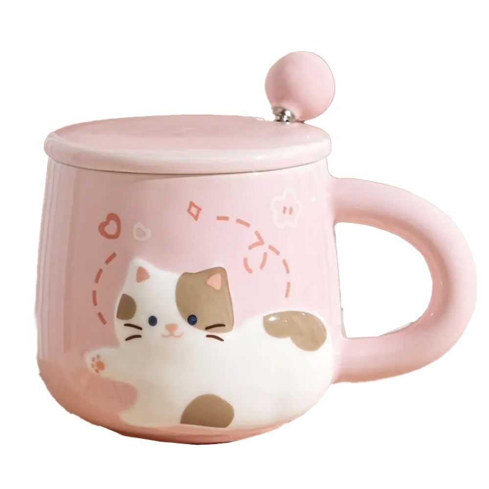Cana cu capac din ceramica si lingurita Pufo Happy Kitty pentru cafea sau ceai, 350 ml, roz