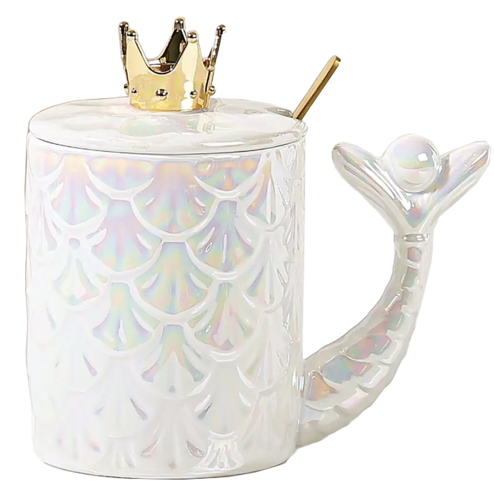 Cana cu capac din ceramica si lingurita Pufo Princess pentru cafea sau ceai, 300 ml, alb