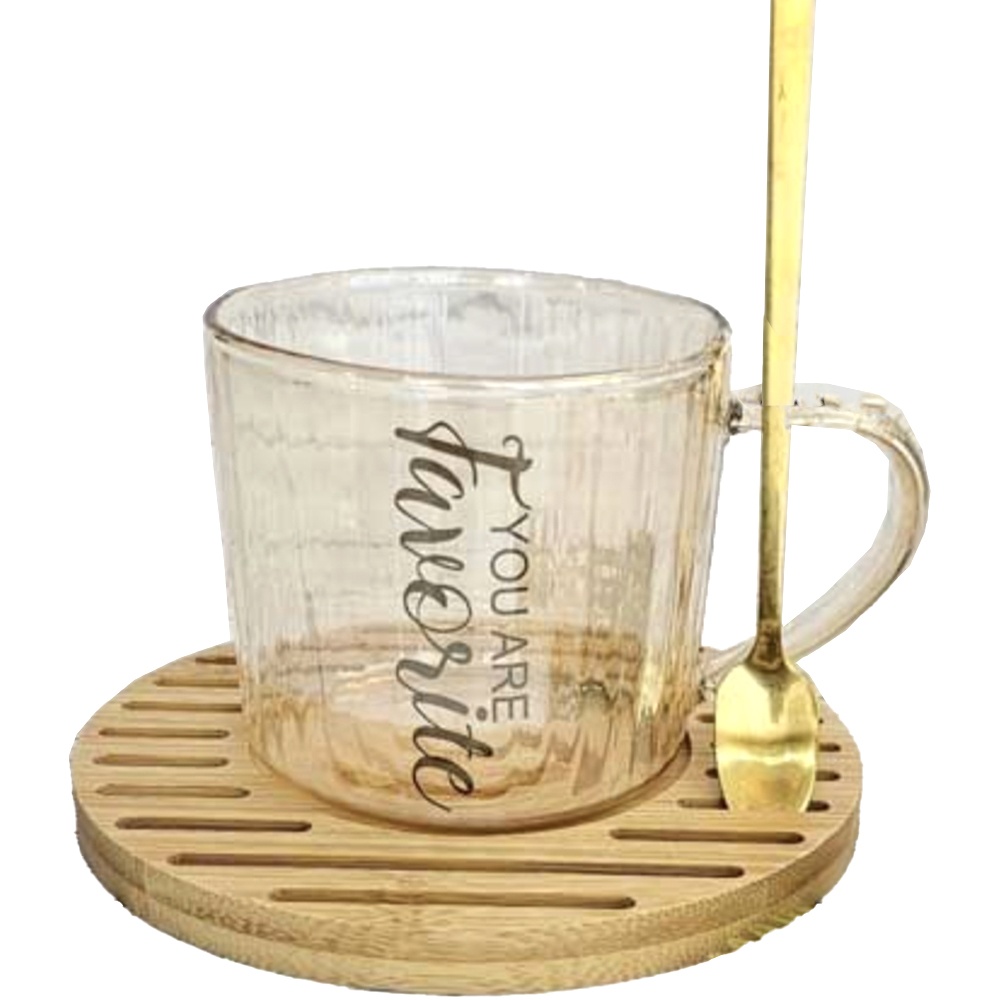 Cana din sticla cu suport din lemn de bambus si lingurita Pufo Favourite pentru cafea sau ceai, 200 ml