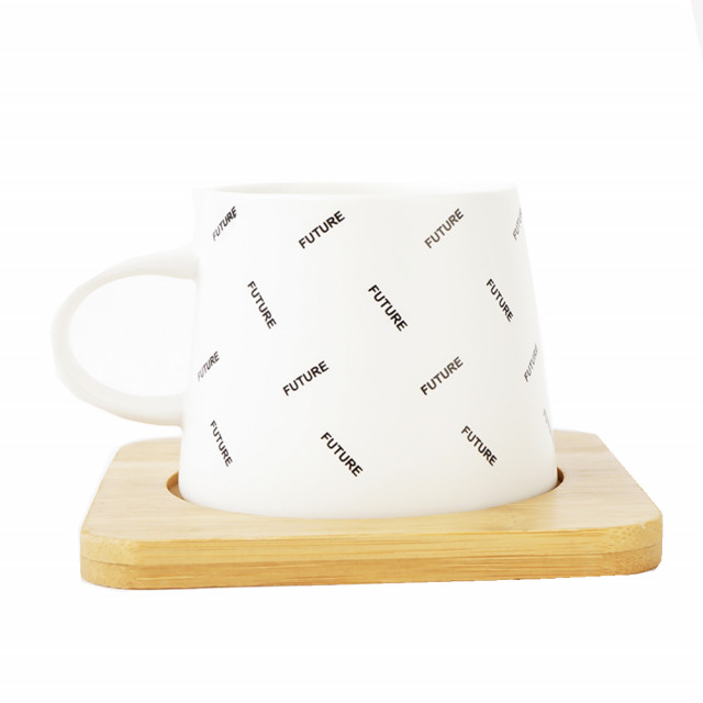 Cana ceramica cu suport din lemn si lingurita Pufo Future pentru cafea sau ceai, 220 ml, alb