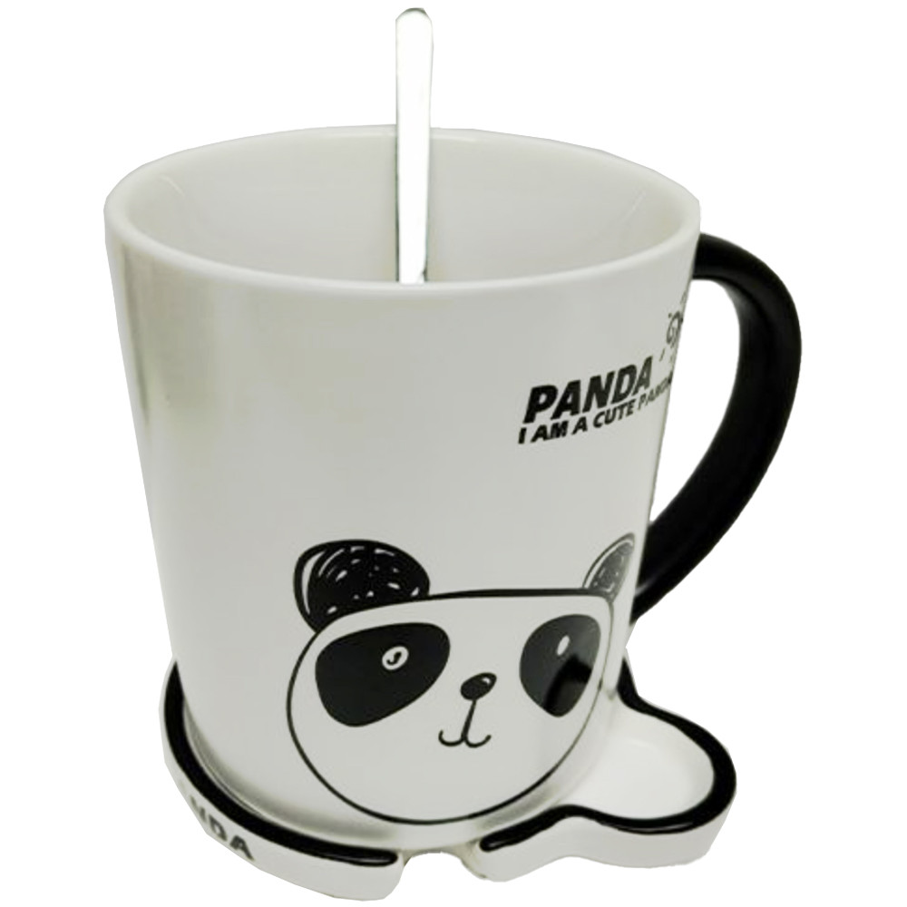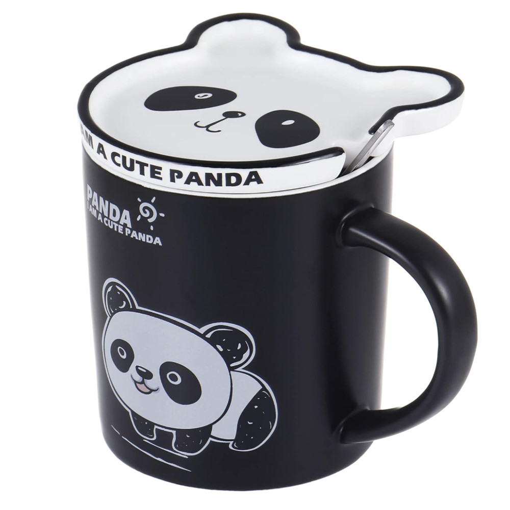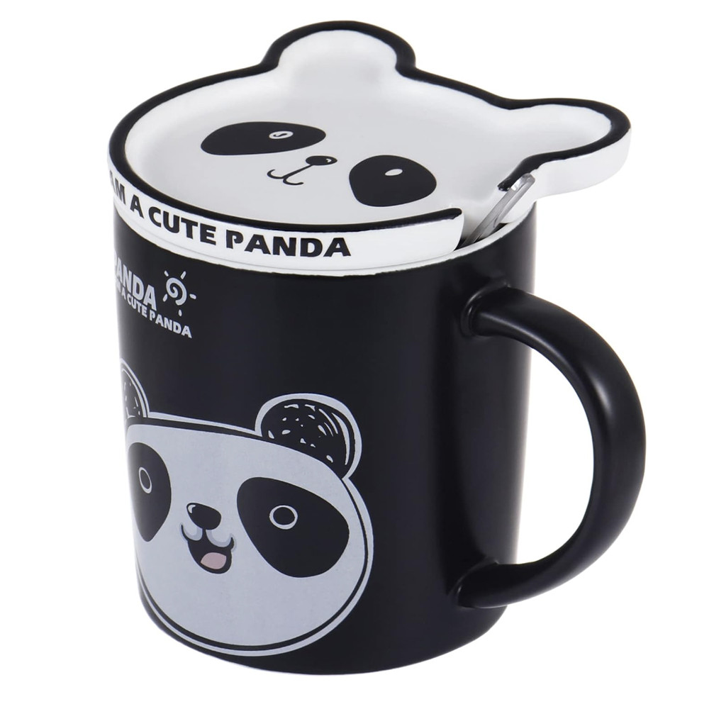 Cana cu capac din ceramica si lingurita Pufo Little Panda pentru cafea sau ceai, 300 ml