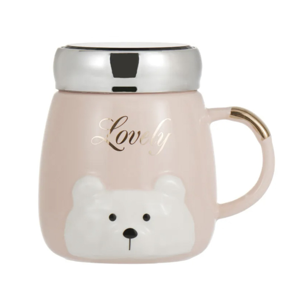 Cana din ceramica cu capac Pufo Lovely Bear pentru cafea sau ceai, 350 ml, roz