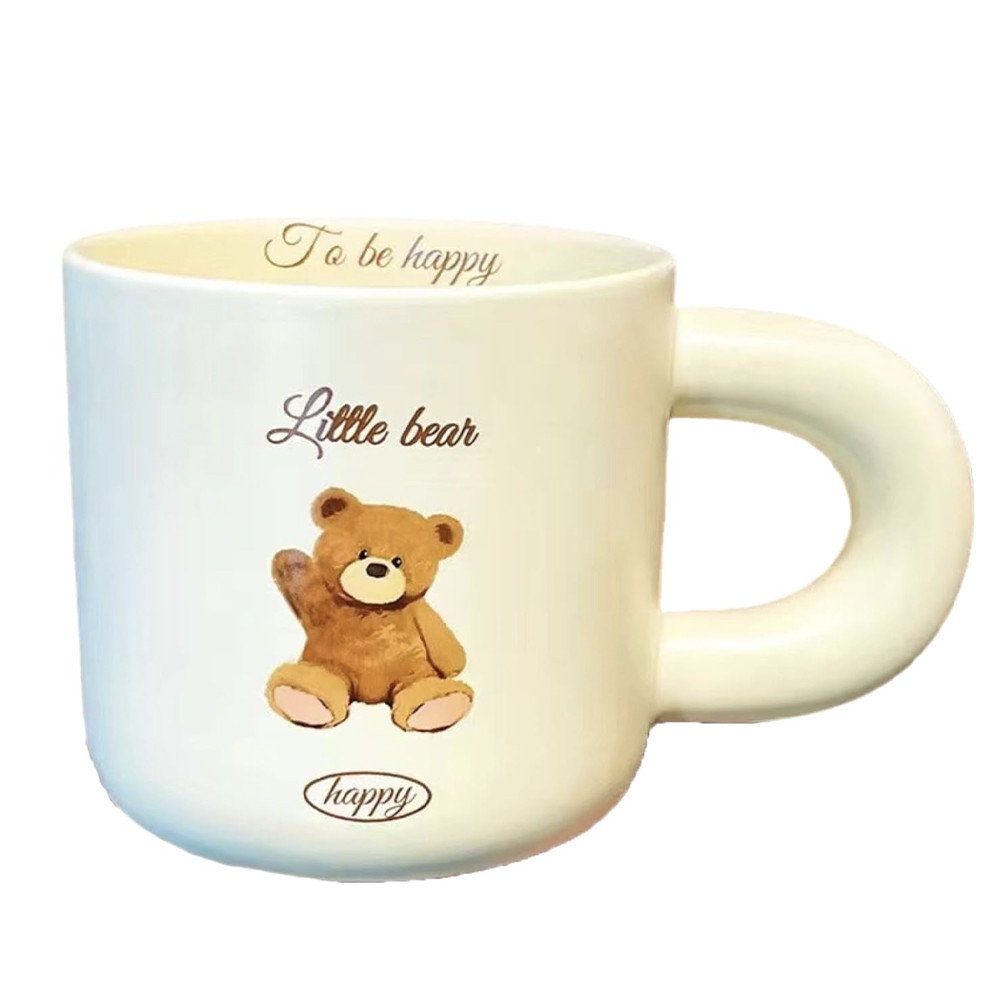Cana cu capac din ceramica si lingurita Pufo Happy Bear pentru cafea sau ceai, 350 ml, alb