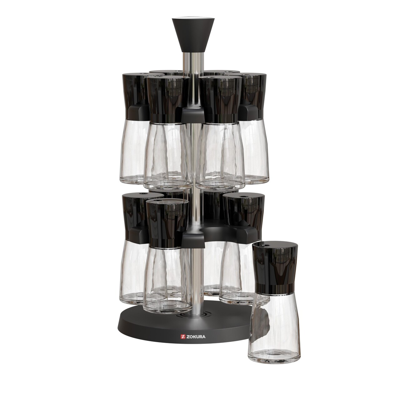 Set Engros de suport cu 12 recipiente condimente, Kamille, din Inox, Rotativ, 18x21cm, Negru/Transparent